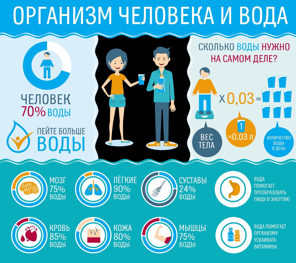 Обезвоживание организма на 10% приводит к физической и психической недееспособности. Потеря 20% воды приводит к смерти. В течение суток от 3 до 6% воды, содержащейся в организме, подвергается обмену. Половина воды, содержащейся в организме, обменивается в течение 10 дней. Количество воды, требуемое для поддержания водного баланса, зависит от возраста, физической активности, окружающей температуры и влажности. Суточная потребность взрослого человека составляет 1,5 – 2,0 л. Еще один немаловажный момент: в общий водный зачет не идут чай, кофе и уж тем более всевозможные соки, лимонады и газированные напитки.